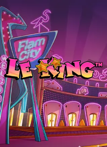 The game opens in a bright, neon Las Vegas Strip-style environment. Le King in star-shaped sunglasses stands alongside the 6x5 grid, with the four jackpot prizes displayed on the other side, glowing in colourful neon.